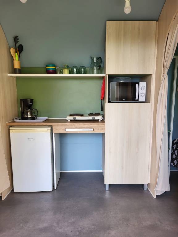 1 kitchenette (plaque cuisson, plancha , micro-onde, frigidaire, vaisselle).
